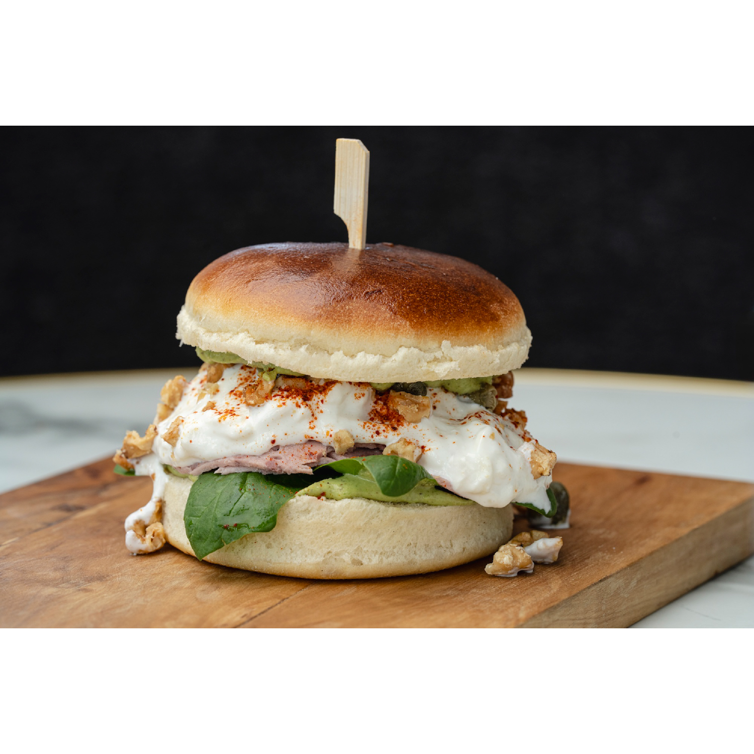 Filet de volaille, salade, tomates, oignons, sauce tartare, cheddar
